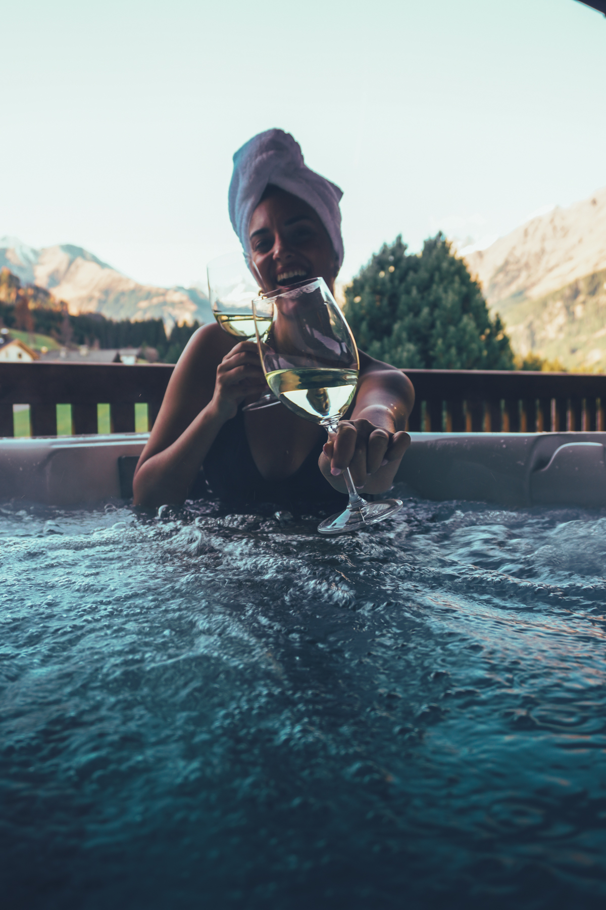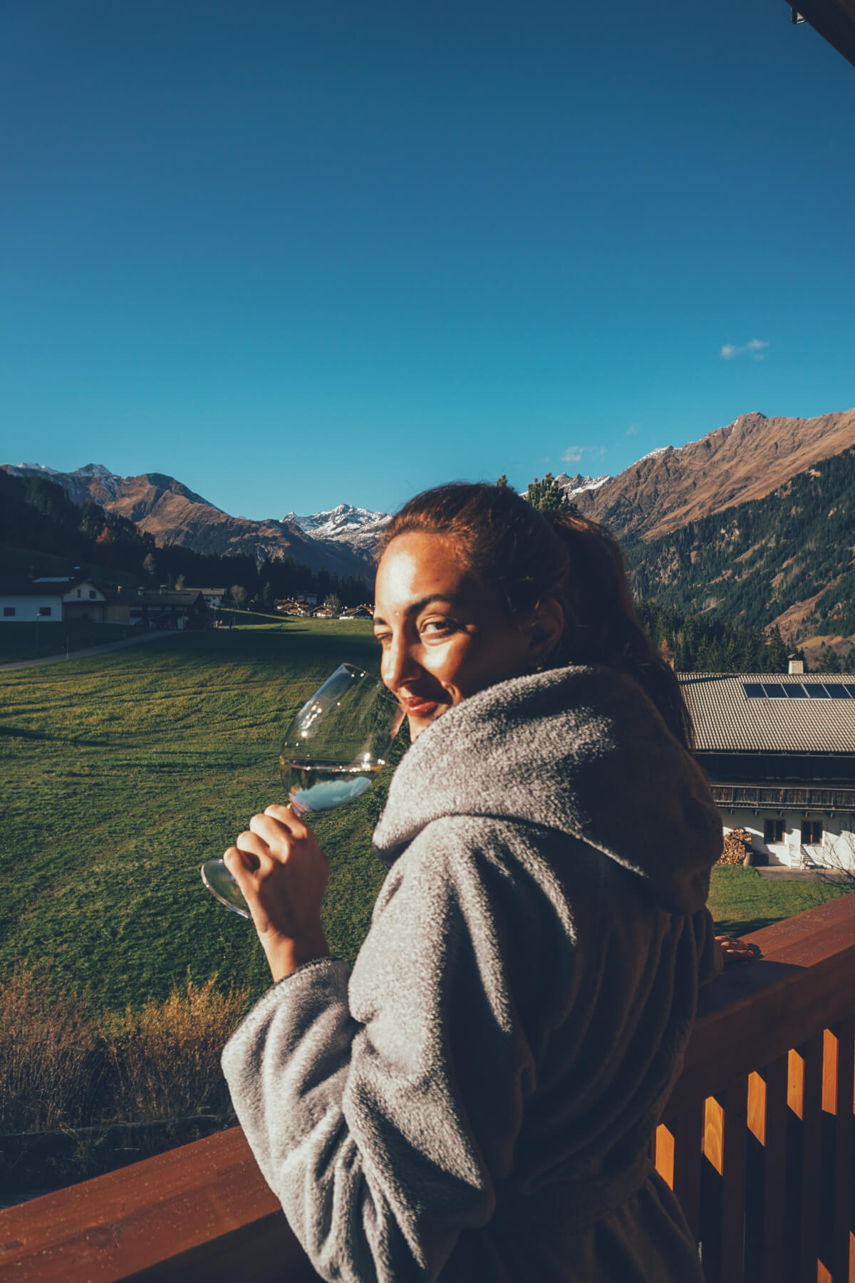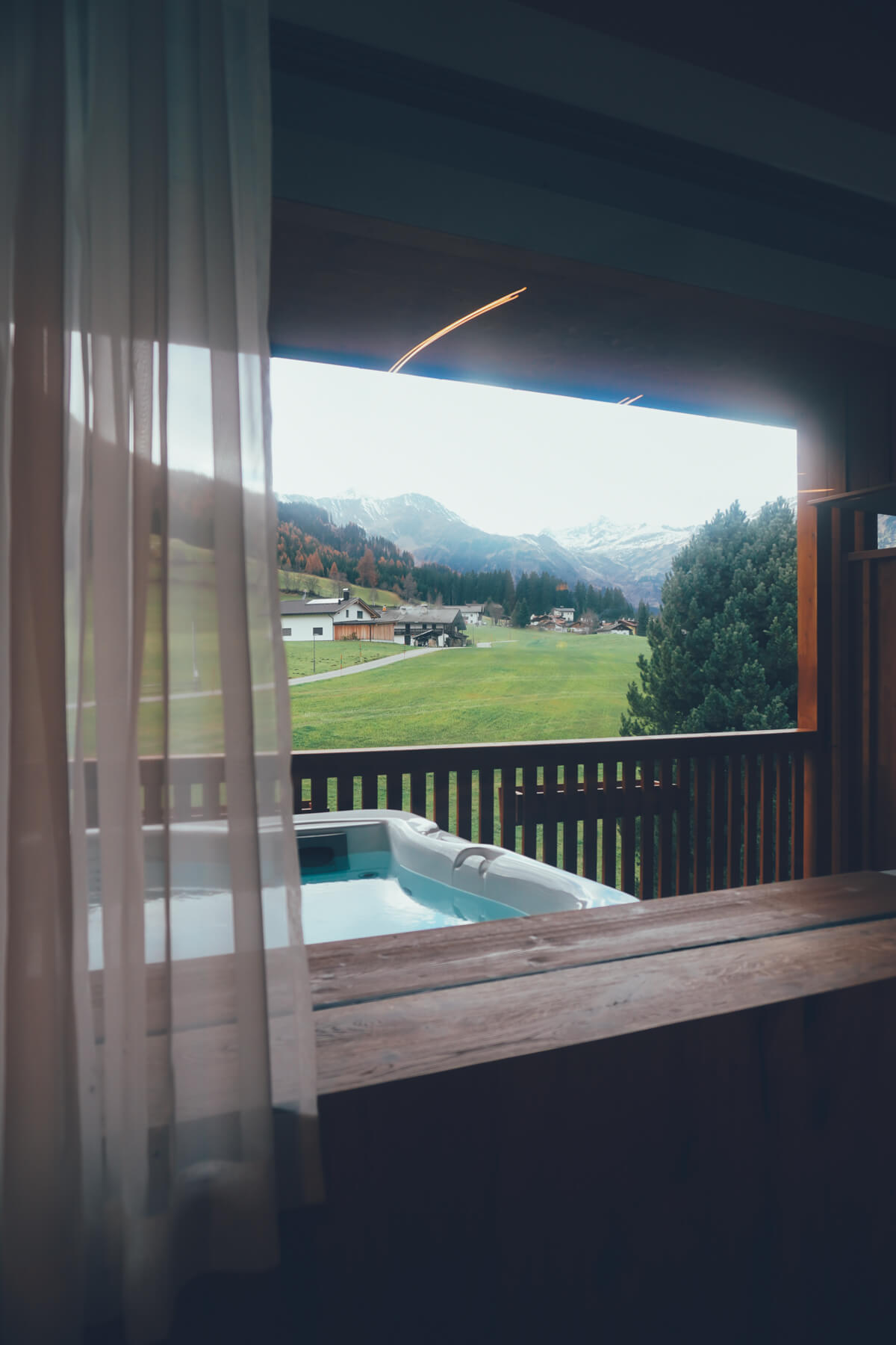 Wir wohnten in der Suite Leonie – Naturholzboden, großzügiger Wohn-Schlafraum und: ein beheizter Whirlpool auf dem Balkon mit Blick auf die Stubaier Alpen. Da saß ich – im Bademantel, Laptop auf den Knien, Dampf über den Bergen. Zum Feierabend ein Gläschen im Whirlpool mit Ausblick. Workation: completed.